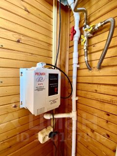 Основной дом - стены брус - обшиты сайдингом, фундамент - лента, отопление - электрический котел, в дом заведен летний водопровод, электричество 15кВт, газ - привозные балоны.
