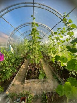 Участок 10 соток, газон, посажены молодые деревья, есть большая теплица.