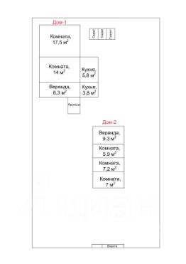 На участке расположено два дома (указано на схеме), а также хозяйственная постройка.
