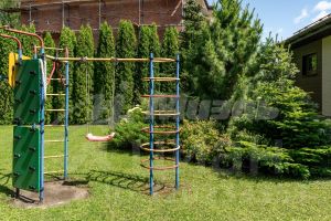 На участке дополнительная постройка для хранения садовой техники и др. Участок благоустроен, высажены туи, профессиональный газон, цветочные клумбы, оборудована детская площадка. Уличное освещение от датчика света.