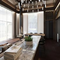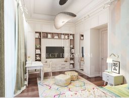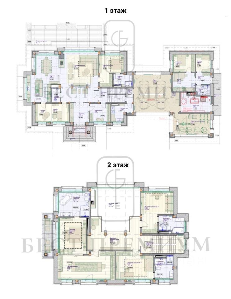 2 этаж: 1 мастер-блок с панорамным балконом, санузлом и гардеробной; 2 детские спальни с санузлами и гардеробными; балкон-библиотека.