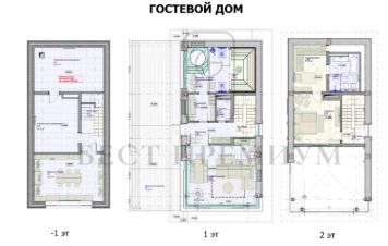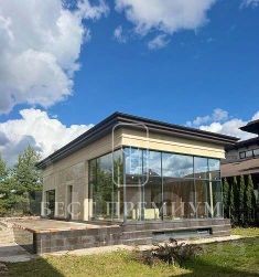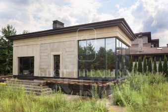 Также на участке построен гостевой дом 253 м² с комнатой отдыха с шикарным панорамным остеклением, сауной, винным погребом и на втором этаже гостевой комнатой с санузлом и гардеробной.