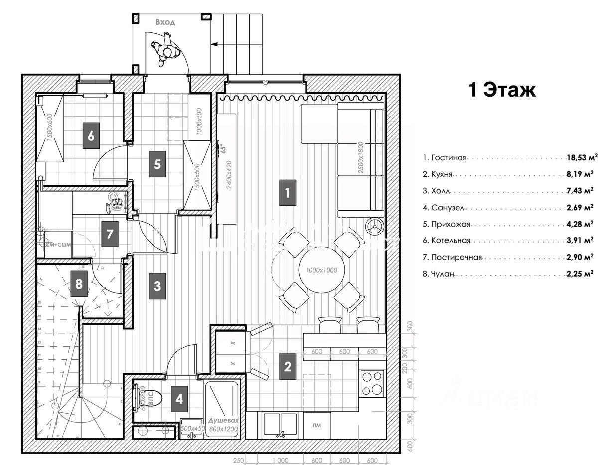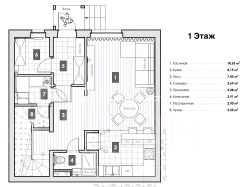 1 этаж: кухня-гостиная, санузел с душем, бойлерная, кладовая