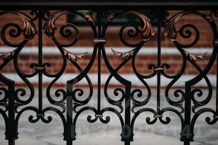 Территория усадьбы огорожена забором высотой 3,5 метра и экранирующими посадками деревьев. Три въезда для владельцев, гостей и персонала.