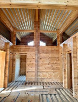 Современный дом в стиле ШАЛЕ, выполнен из экологичного перфорированного бруса, который не требует шлифовки — вложения по внутренней отделке минимальные.