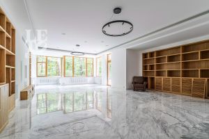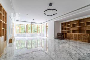Первый этаж: просторная гостиная с дровяным камином, объединенная кухня-столовая, элегантная прихожая, кабинет с камином и отдельным санузлом, а также мастер-спальня с индивидуальной мебелью, Спа-комплекс (бассейн, сауна, хамам, душевая, уборная).