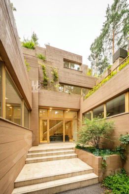 Внешняя архитектура дома выполнена в современном стиле здесь очень много окон, преобладание кубических форм, большое количество террас с озеленением, в отделке фасада использован декоративный бетон.