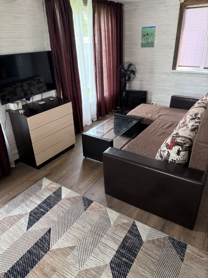 На первом этаже расположены гостиная с угловым диваном, кухня, гостевая комната и ванна. ламинат, подогреваемый пол. На втором этаже: спальня, комната и кабинет с небольшим спальным местом. В доме четыре изолированных комнаты + гостиная, большая терраса 7х3 м.