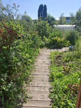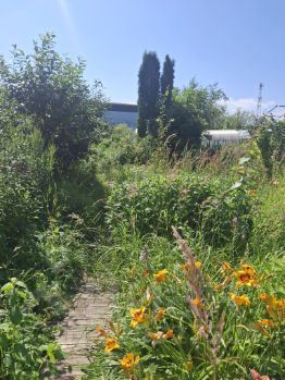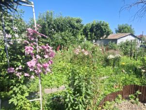 На участке есть кустарники (малина, крыжовник)и деревья (елка, яблони, груши, вишня, туи), цветы: розы, флоксы, гортензии.