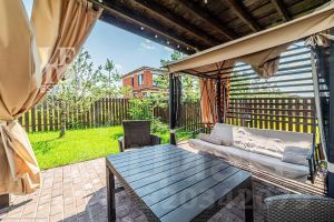 Участок полностью огорожен, установлены въездные ворота с электроприводом. Сделан дренаж, выстелен газон, посажены декоративные кустарники. Дополнительно построена летняя беседка. К дому пристроен навес на два автомобиля.