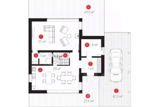 1 этаж: холл, гостиная с камином и выходом на террасу заднего двора, кухня-столовая с выходом на террасу, с/уу, котельная, кладовая под лестничным блоком, навес для машины.