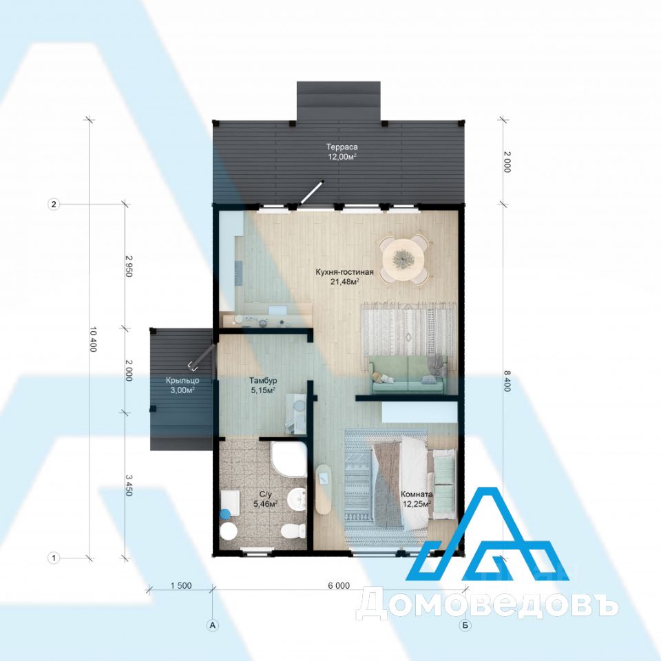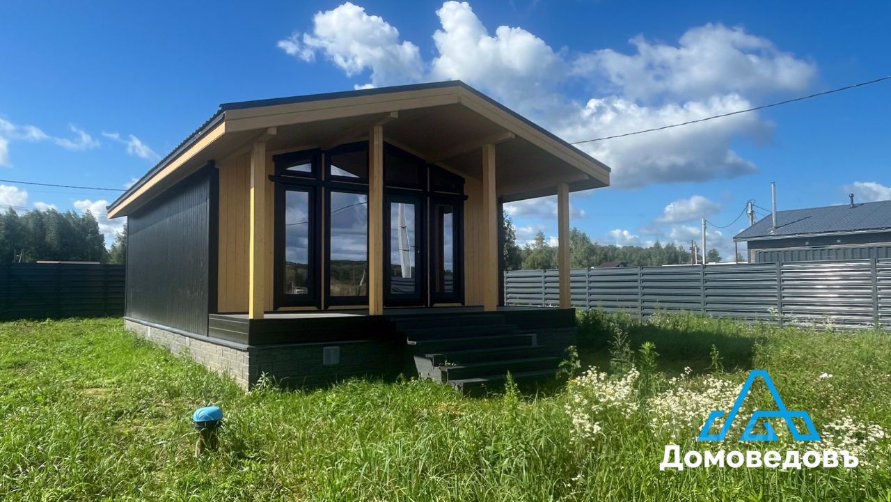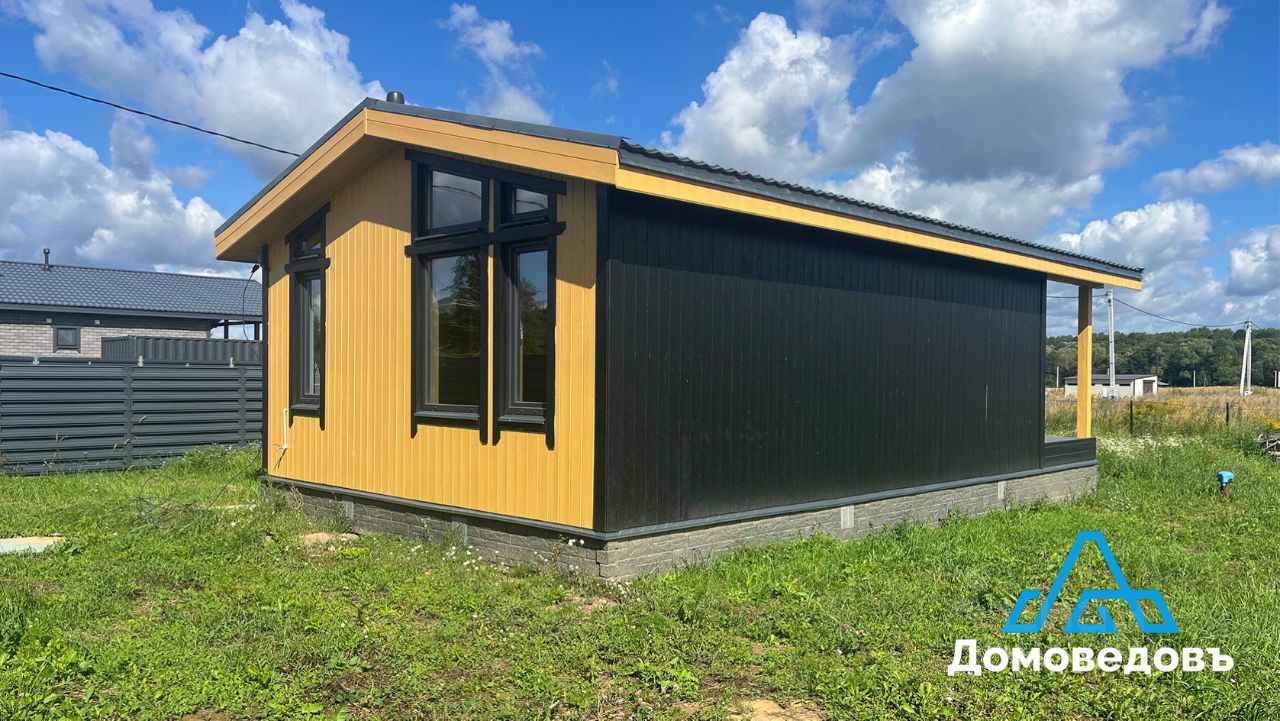 В доме кухня-гостиная площадью 21 кв. м с выходом на террасу 12 кв. м, комната 12 кв. м, санузел и прихожая.