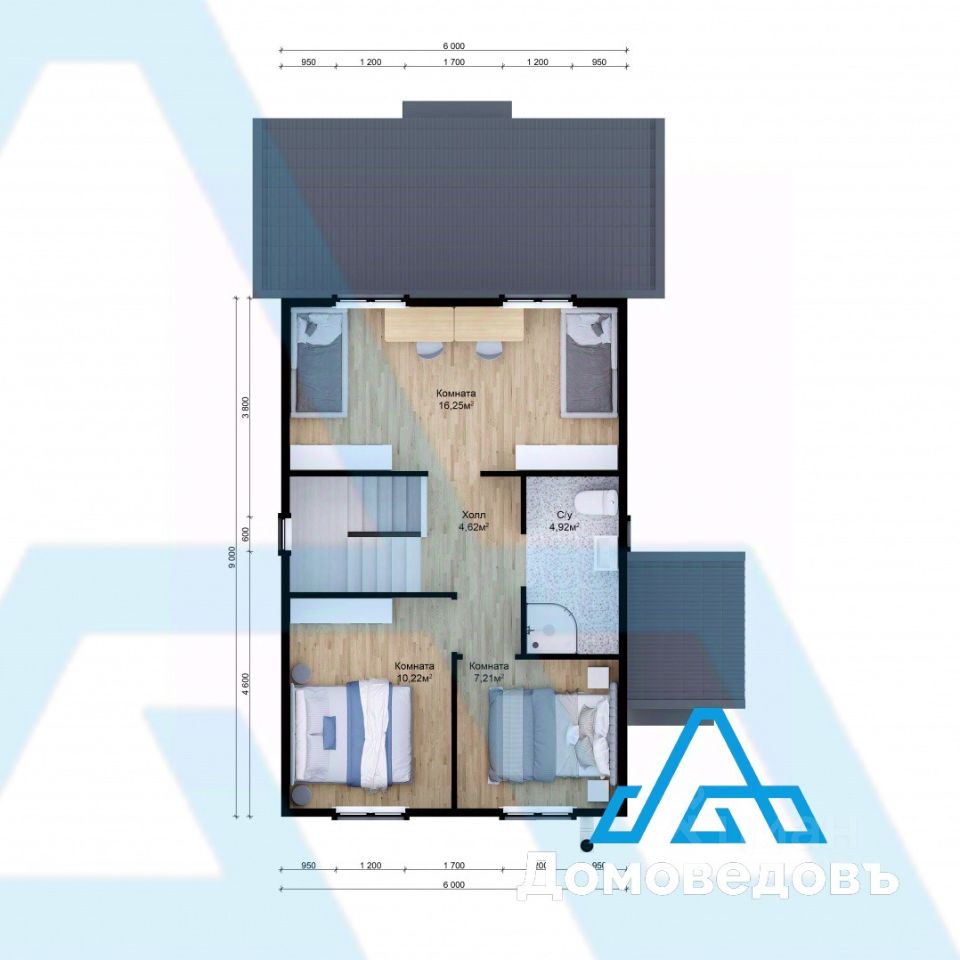 На 1 этаже терраса 15 кв. м, кухня-гостиная 16 кв. м и комната 10 кв. м, а также холл, санузел и техническое помещение. На 2 этаже три комнаты по 7 кв. м, 10 кв. м и 16 кв. м и санузел.