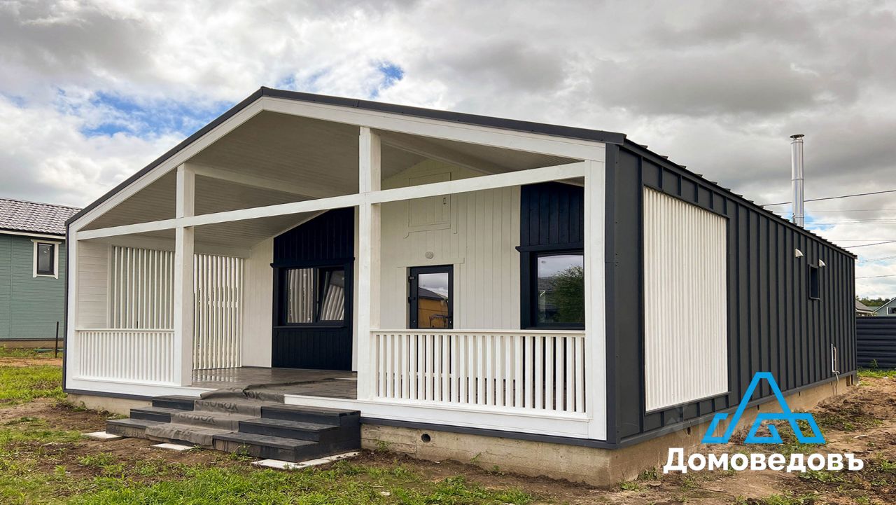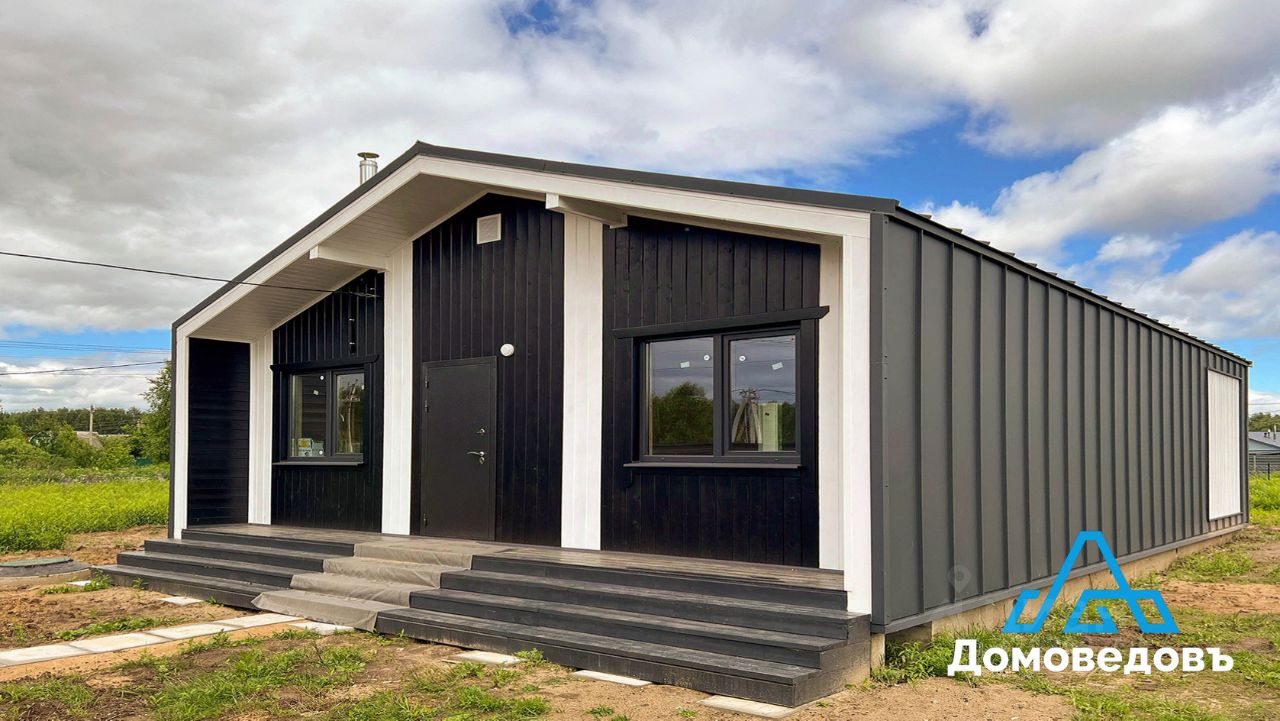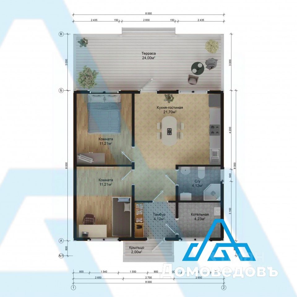 В доме кухня-гостиная площадью 22 кв. м с выходом на террасу 24 кв. м, две комнаты по 11 кв. м, санузел, холл и техническое помещение.