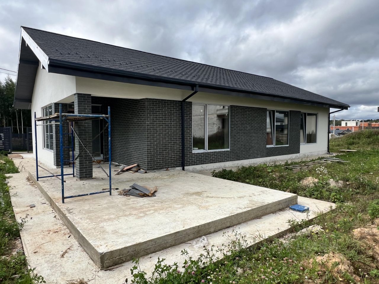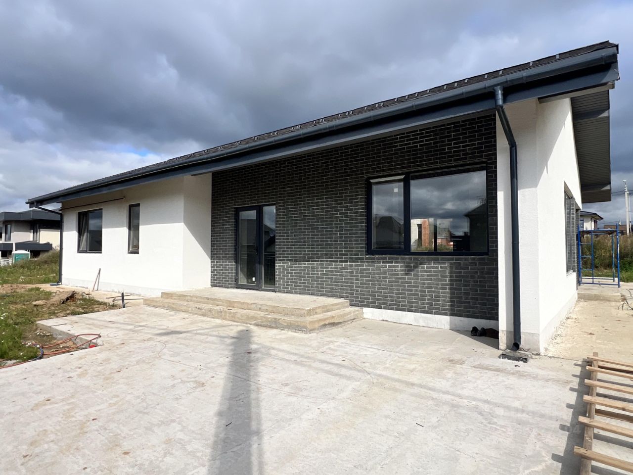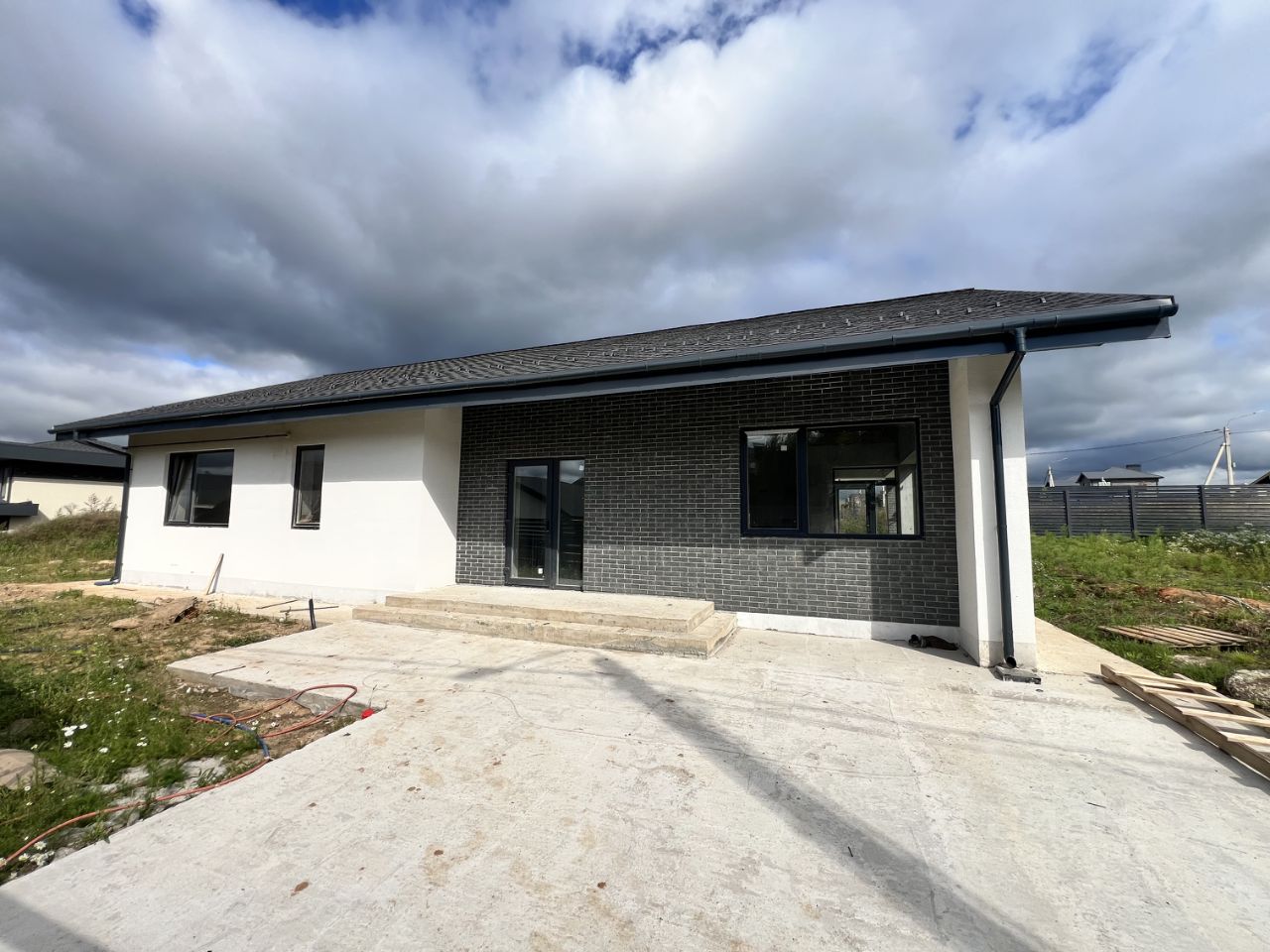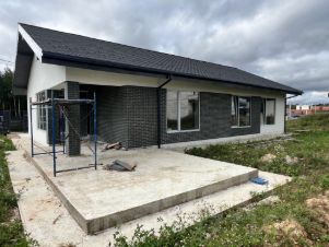 В доме выполнена предчистовая отделка: отштукатурены стены, заведена вода, канализация, электричество, в процессе монтаж газового оборудования.