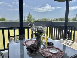 Дом каркасный, для круглогодичного проживания . Удобная планировка - три изолированные спальни, просторная кухня-гостиная, санузел . Большие панорамные окна в гостиной и кухне создают уют, дом очень светлый и солнечный.