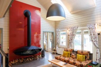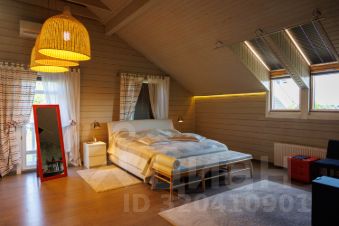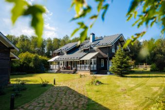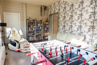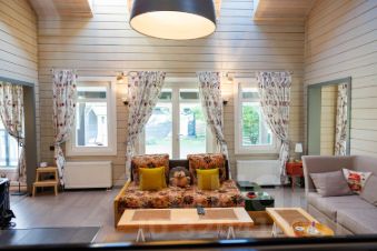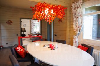 Дом построен из качественного клееного бруса. На первом этаже - свободная планировка с широкими проходами, создающая ощущение единого пространства. Там расположена кухня со всем необходимым оборудованием, отдельная столовая, просторная гостиная со вторым светом и комната отдыха с массажным креслом. Также на первом этаже имеется кладовка/постирочная и гостевой санузел.