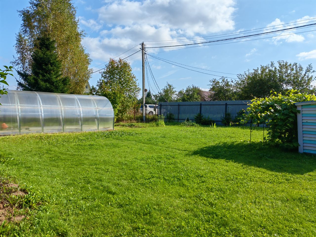 Забор штакетник с откатными воротами. На участке два хозблока, теплица 6х3. Плодовые деревья и кустарники. К участку примыкает огороженная зона, где удобно оставлять автомобиль не заезжая на участок.