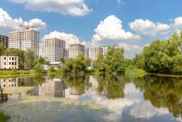 - Детская площадка и благоустроенный пруд в поселке