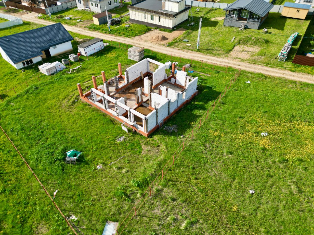 Все документы на материал имеются если надо.Выход под коммуникации уже заложены в фундамент,при желании можно изменить проект на одноэтажный дом.по всему дому сделаны бетонные опоры.Размеры заложенного фундамента 14*12 метров.Многие живут уже постоянно,из коммуникации есть электричество и оплачено подведение газа к границам по агентскому договору,в ближайшее время будет подведение,у некоторых в поселке газ уже в доме! Установлены столбы по периметру участка и бонусом на участке есть много бетонных плит снятых с жд платформы,можно организовать парковочную площадку.