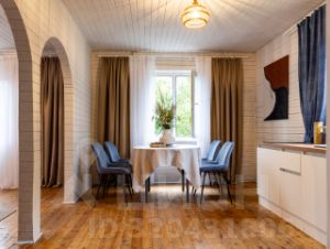 Современная кухня (новый двухкамерный холодильник, электр. варочная панель, раковина с гибкой лейкой. Угловой раскладной диван. Новые стеклопакеты на всех окнах (кроме террасы). Есть место под установку печи-камина. На стенах актуальная интерьерная живопись. Новая входная мет. дверь.