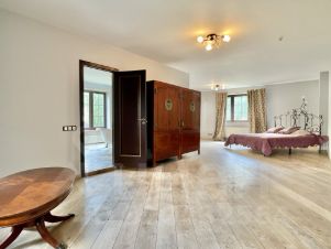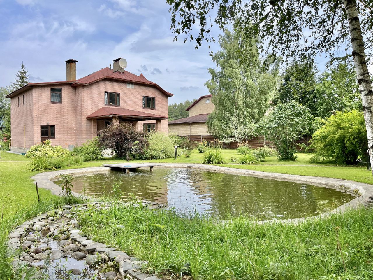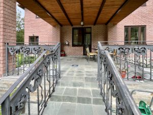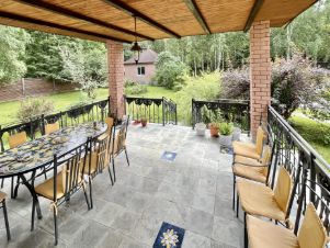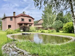 Участок примыкает к лесу и имеет свой выход в лес. На участке выполнены ландшафтные работы, освещение, пруд-бассейн с циркуляцией и фильтрацией воды, сосны, ели, березы, кустарники, зимняя беседка-барбекю с санузлом и душем, двухэтажный гараж на два автомобиля, квартира для проживания персонала. Резервный генератор на 7кВт. Все строения отапливаемые от собственной котельной. Общая площадь строений (коттедж, беседка, гараж, квартира) 467 кв.м.