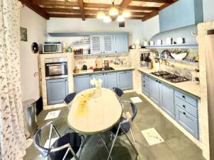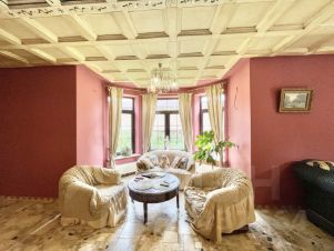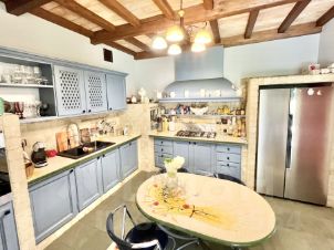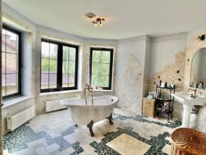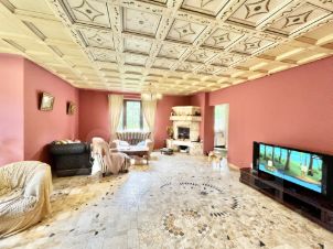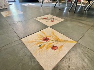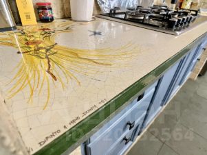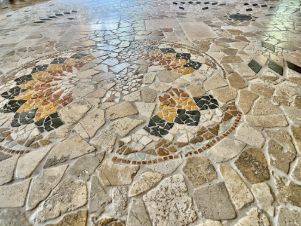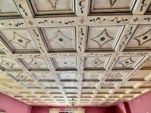 Пол первого этажа итальянский травертин, выложен уникальным рисунком в традиционном стиле палаццо. Потолок кессонный из гипсовых и глиняных панелей, расписанных вручную итальянскими мастерами.