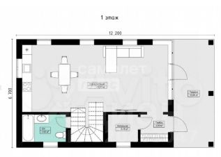 На первом этаже просторная кухня-гостиная, санузел, котельная, просторная прихожая, выход на террасу.