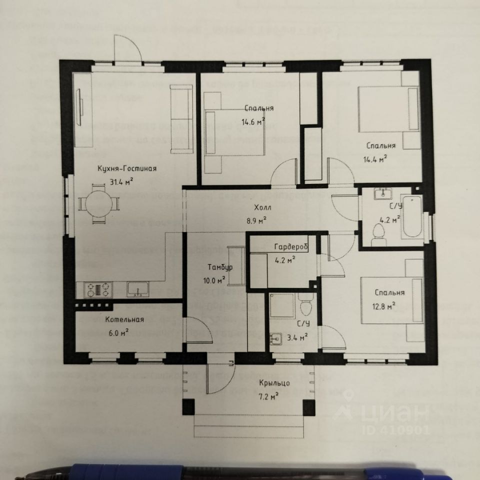 Планировка: просторная кухня-гостиная и 3 спальни, 2 санузла и гардеробная. Окна в кухне-гостиной в пол, высота потолка 3 метра.