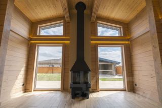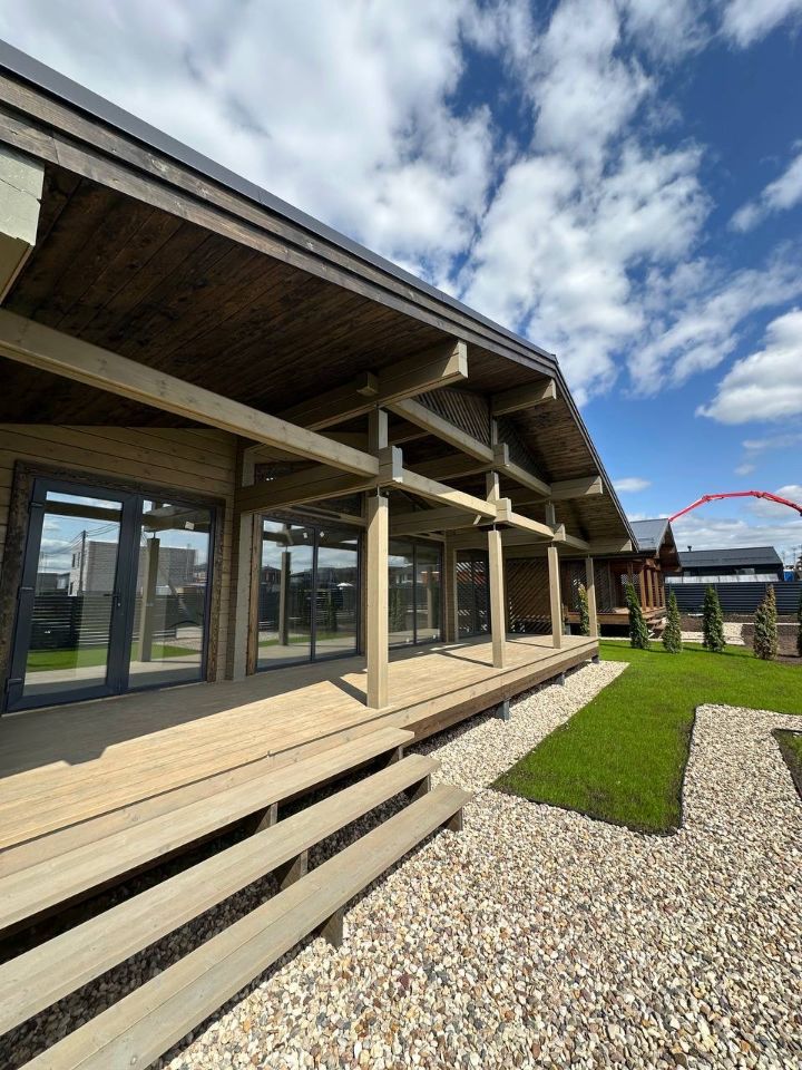 **Экологичный клееный брус** с панорамным остеклением и продуманной планировкой