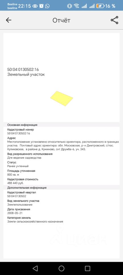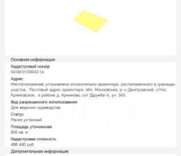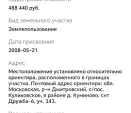 Продается участок, Московская область, Дмитровский район, Куликовское с/п,в районе д. Куминово,Снт Дружба-6,уч.343. (в циан его нет, поэтому выбрала ближайший 355) По координатам на фото можно приехать, посмотреть место. Постаралась максимально точно указать. Но. Это не точные координаты участка, см. Фото, там есть схема или по навигатору. Карты показывают СНТ Майское, потому что он ближе к этому СНТ, но по документам Дружба 6. Смотрите инфу по кадастровому номеру в росреестре. Канал им Москвы пешком 5 минут - купание, теплоходы. Хвойные леса, грибы, ягоды, воздух. Участок в поле, есть снижение уровня от дороги. рядом тоже пустые участки, можно купить и соседние со всех сторон. Чтобы точно найти этот участок, нужно будет вызвать геодезиста и поставить колышки. Вопрос цены 1000 за 1 колышек. Межевание проводилось. в 2008 году, колышки ставили, но они заросли. Участок не огорожен, совсем пустой абсолютно, с молодыми деревьями, без забора, без строений, без совсем ничего. Земля плодородная. Находится на втором поле, через мостик. Заезд на машине через д. Татищево. Красивое место, много лесов, очень чистый воздух, канал им.Москвы - пешком около 5 минут. Электричество по границе,столбы, подключается напрямую от мособлэнерго, вода - надо копать колодец, дорога щебенка до участка. Продажа от собственника. Кадастровый номер: 50:04:0130502:16 Статус объекта: Ранее учтенный Дата постановки на кадастровый учет: 21.05.2008 Категория земель: Земли сельскохозяйственного назначения Разрешенное использование: Для ведения гражданами садоводства и огородничества Площадь: 800 Прописаться можно при постройке жилого дома. Адрес (местоположение): обл. Московская, р-н Дмитровский, с/пос. Куликовское, в районе д. Куминово, снт "Дружба-6", уч. 343 Торг небольшой, цена ниже некуда. возможен обмен на участок, жилье. Других фото нет, просмотр самостоятельно по координатам и кадастровому номеру. Точно участок не покажу и не знаю, тольео ориентировочно на поле!! Взносы не собираются, долга нет. Фактически, как участок в деревне. Без взносов. Приезжайте, смотрите, если понравится, пишите.