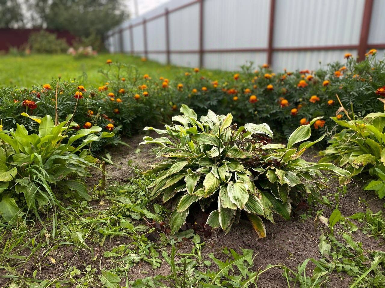 В передне дома, на небольшой клумбе царит настоящий цветочный рай, где каждый уголок наполнен яркими красками и ароматами. За домом раскинулся огород с грядками, где зреют кабачки, тыковка, помидоры и огурцы, а вдоль забора растут кусты смородины и малины.