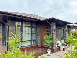 Фундамент монолит - ж/б плита плюс лента, стены из пеноблока, облицованы клинкерным кирпичом, окна из профиля Rehau с двухкамерными стеклопакетами, мягкая кровля KATEPAL.