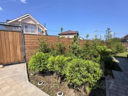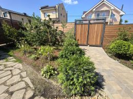 Участок расположен в середине поселка, на горке, с небольшим уклоном сухой. Начали делать ландшафтный дизайн, засеян газон и посажен сад. Парковка для 2 а/м.