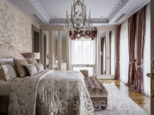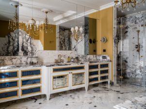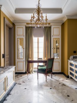 • В отделке использованы только эксклюзивные материалы: интерьерные краски Little Greene (Англия) и Argile (Франция), итальянские сорта мрамора премиум-класса — Calacatta, Carrara, Statuario, паркет из редких пород дерева, встроенная мебель фабрики Luciano Zonta (Италия), люстры Saint-Louis (Франция) и Baccarat (Франция).
