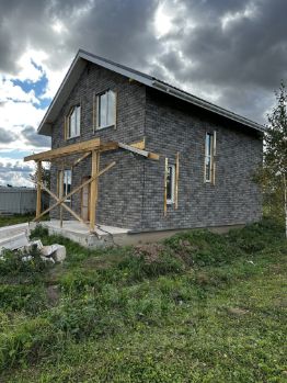 Дом из газосиликатного блока для круглогодичного проживания, толщина наружных стен 35 см (внешнее утепление 5 см). Кровля металлочерепица, окна пластиковые стеклопакеты, блочные перегородки, штукатурка стен, фундамент ленточно-свайный, залиты монолитные плиты перекрытия