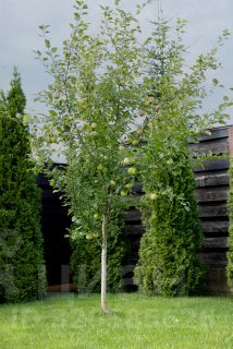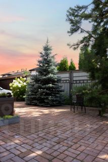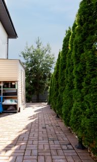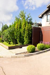 Благоустроенный участок правильной формы с несколькими плодовыми деревьями и кустарниками. По границе участка растут красивые туи.