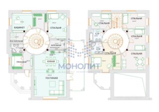 В доме 6 спален, 3 санузла, кабинет, кухня, гостиная со вторым светом, панорамным окном, дровяным камином (над камином итальянское мозаичное панно) и выходом на террасу. В