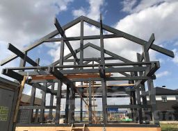 Построен по технологии фахверк из клееного бруса, он готов к индивидуальной отделке и оснащен продуманной планировкой для максимального комфорта. Внешний вид дома подчеркивает современный подход не только к строительству, но и архитектуре.