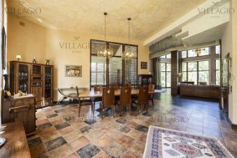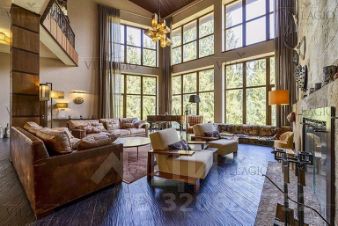 Центральное звено дома — каминный зал со вторым светом, большими окнами и мебелью в колониальном стиле. Все детали подчеркивают экологичность этого дома и излучают изысканность, а за счёт тёплых оттенков дарят ощущение уюта: коричневые кожаные диваны, массивные кресла разных моделей, шоколадно-бордовые ковры и песочные абажуры.