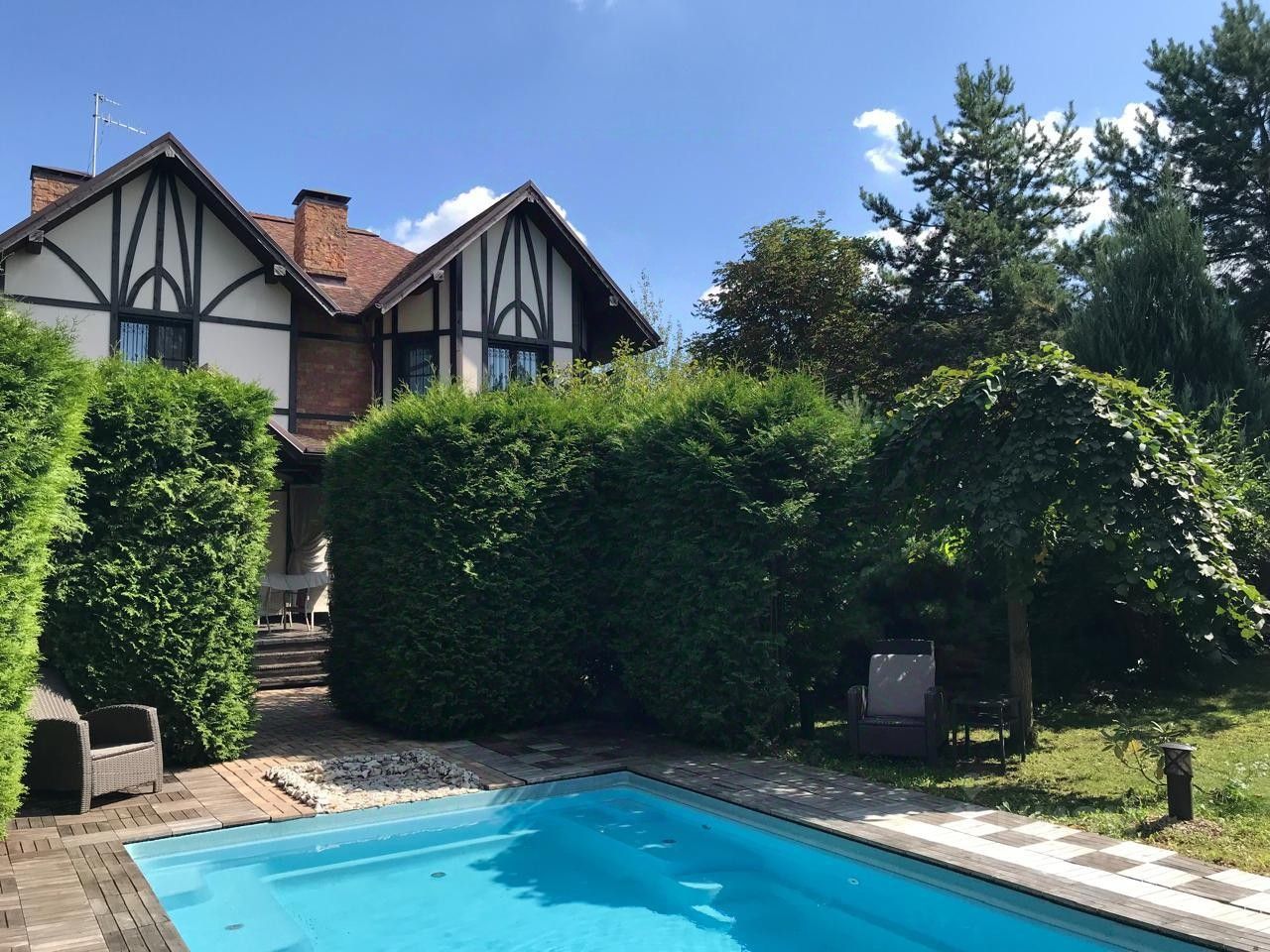 На участке вас ждет беседка для барбекю, где летние вечера наполнятся ароматом жареного мяса и веселым смехом друзей. Спортивная площадка с покрытием из резиновой крошки приглашает к активным играм с баскетбольным кольцом и хоккейными воротами. Навес для автомобилей, открытая терраса с крышей, площадка у бассейна, вымощенная садовым паркетом, скамья со штангой и детская площадка с песочницей каждый уголок здесь продуман до мелочей.