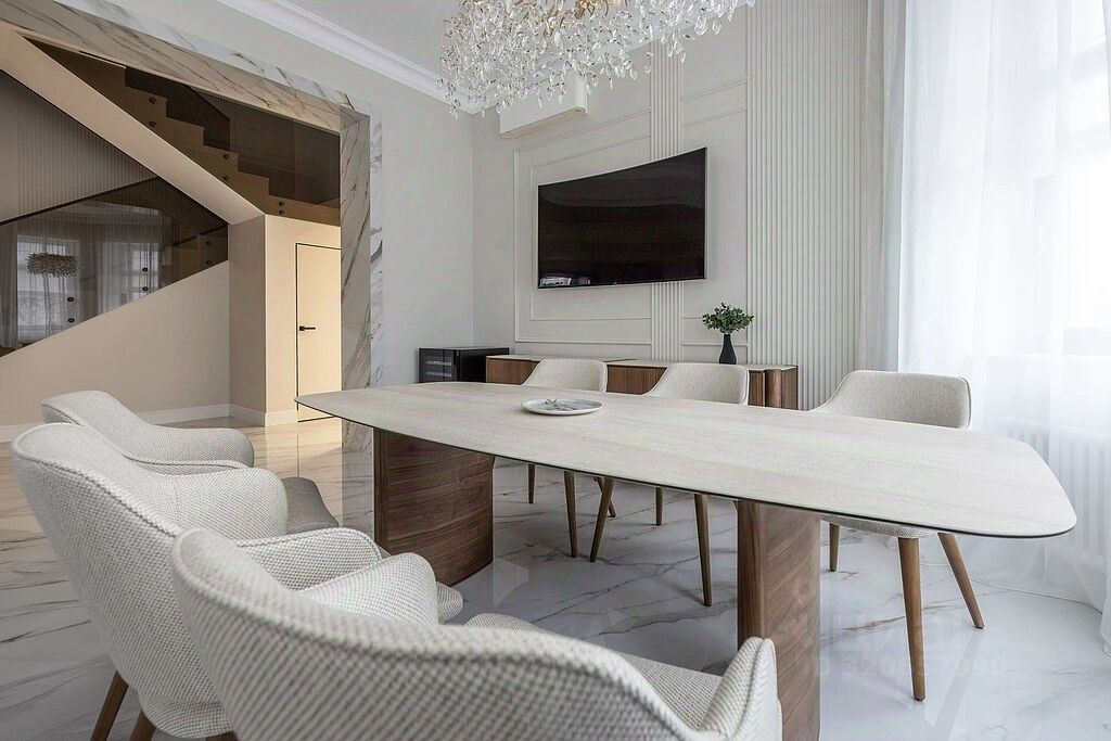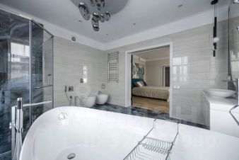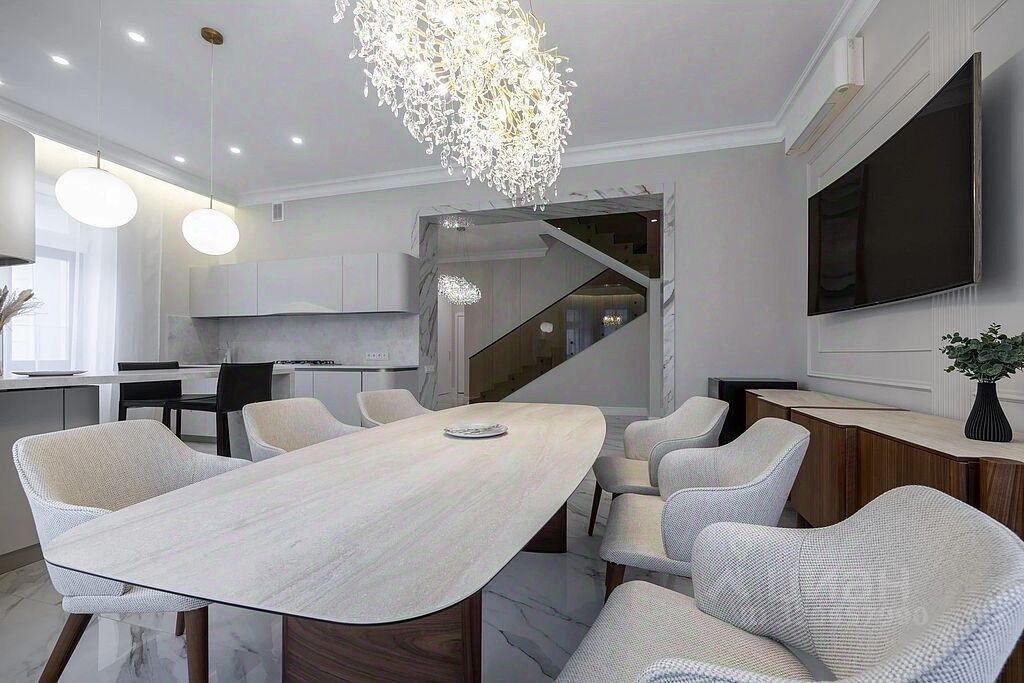Диваны-трансформеры Norr Mobler (Бельгия). Итальянские кухни Snaidero с встроенной бытовой техникой Miele. Столовая зона Liostre и другая мебель, изготовленная на заказ. Сантехника и мебель для ванных комнат Villeroy&Boch. Освещение Wertmark (Германия), Odeon (Италия), ST-Luce (Италия).