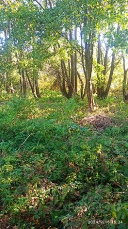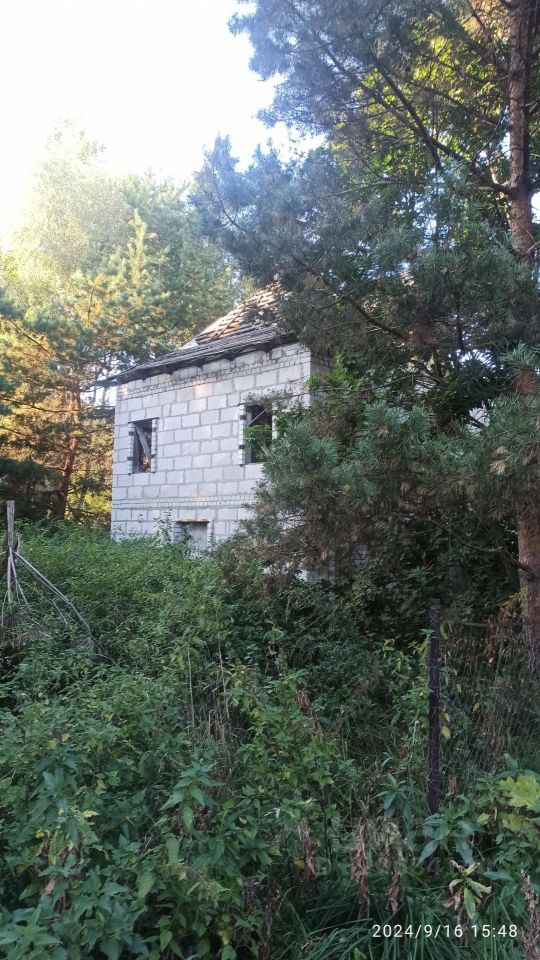 На участке есть электричество, недостроенный дом из газоблоков и небольшой пруд в форме сердца. По краям участка растут вековые деревья, создавая живописную атмосферу для будущей усадьбы.