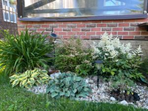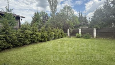 На участке ровный газон, дизайнерские клумбы, большие туи вдоль забора создают уютную атмосферу уединения и комфорта, яблони, ягодные кустарники.