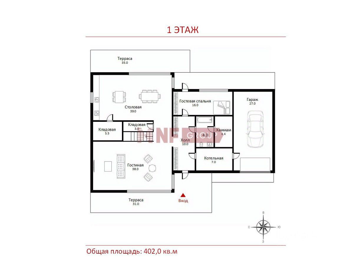 1 этаж: Холл, с/у, хаммам, котельная, гостевая спальня с выходом во двор, гостиная с выходом на террасу, кладовая, кухня-столовая с выходом на террасу, гараж на 1 м/м;