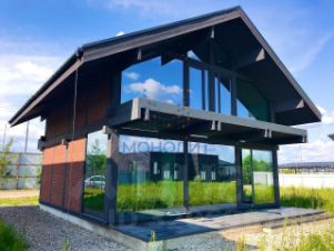 - Площадь 170 м², фахверк-конструкция, панорамные окна.