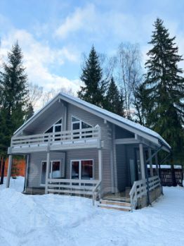 Новый коттедж из клееного бруса в стиле Шале, расположенный на участке 7 соток, с возможностью расширения до 17 соток. Общая площадь 186 кв.м., панорамное остекление, второй свет, крыша-финская мягкая черепица, окна BrusBox, толщина стеклопакета-70 мм, 3-х камерный, фурнитура Rotо, монолитный бетонный фундамент. Планировка 1 этаж: крыльцо, прихожая, гардеробная, топочная, санузел, холл, кухня-гостиная с панорамными окнами и выходом на крытую веранду, большая спальня. Планировка 2 этаж: лестница, холл, санузел, 3 спальни, из 2 спален выход на балкон на 2 этаж. Время в пути от Москвы до поселка 35-40 минут.