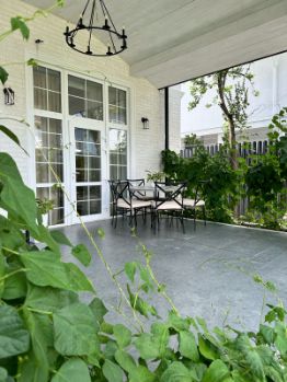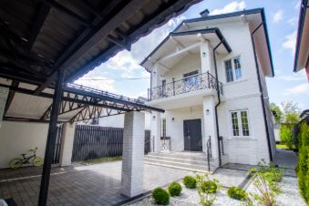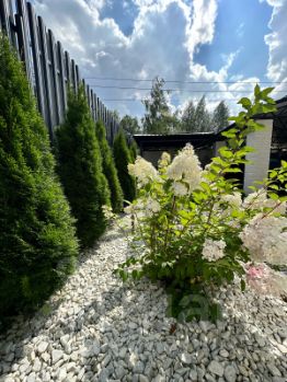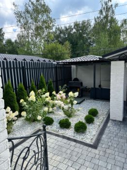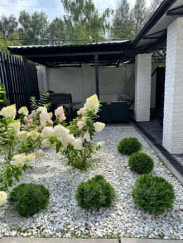 Обустроенный двор: навес для парковки 2-х автомашин, зона барбекю, автоматические откатные ворота, двор выложен брусчаткой. Высажены плодово-ягодные кустарники (смородина, крыжовник, шиповник), деревья ( яблоня, груша, вишня). Сирень, жасмин, кусты гортензии. А также на участке высажены Туи с хостами.