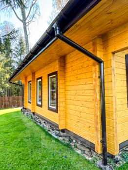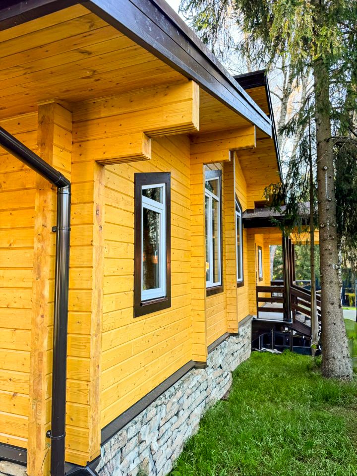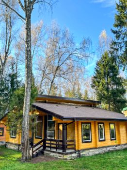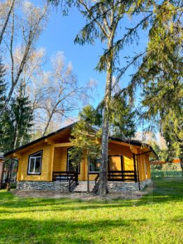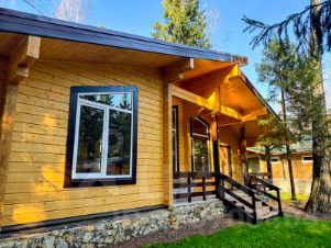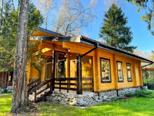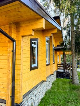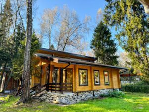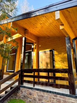 Новый коттедж из клееного бруса в стиле Шале, расположенный на участке 7 соток, с возможностью расширения. Общая площадь 130кв.м., панорамное остекление, второй свет, крыша-финская мягкая черепица, окна BrusBox, толщина стеклопакета-70 мм, 3-х камерный, фурнитура Rotо, монолитный бетонный фундамент. Планировка 1 этаж: 2 крыльца, прихожая, гардеробная, топочная, санузел, холл, кухня-гостиная с панорамными окнами и выходом на веранду, 3 спальни. Время в пути от Москвы до поселка 35-40 минут.