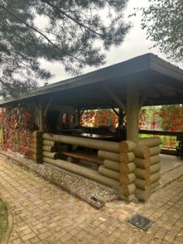 Беседка из бревна с зоной барбекю- 50 кв.м. В беседку заведено электричество и водопровод, оборудована мангальная зона.